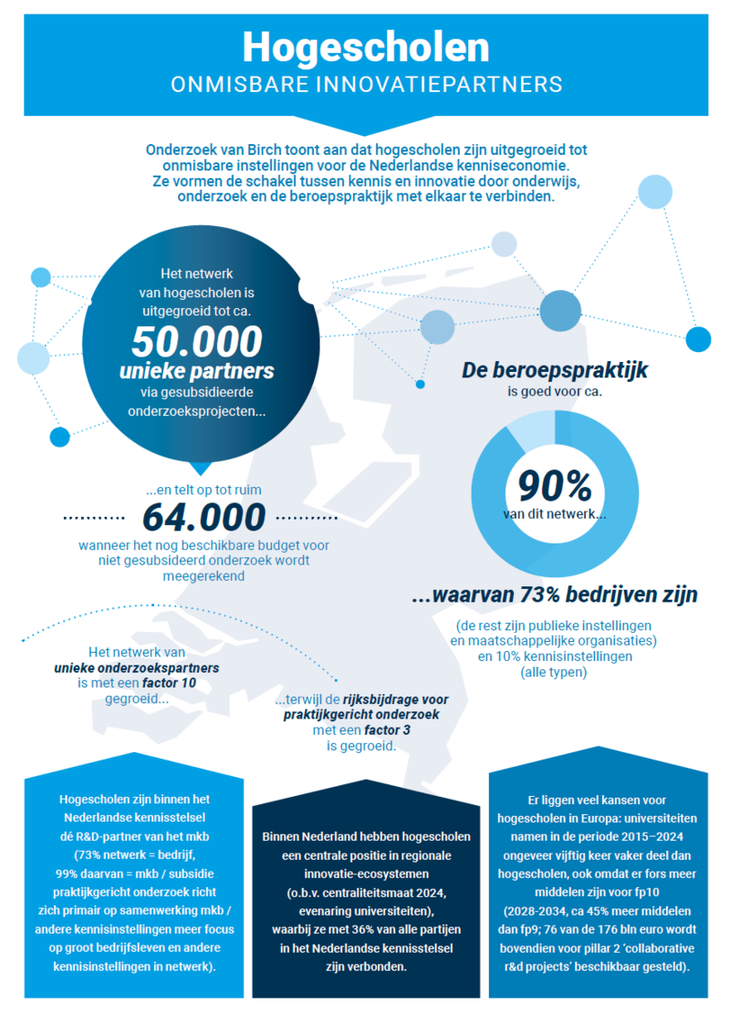 Hogescholen zijn in tien jaar tijd uitgegroeid tot een kernspeler in innovatie. Uit een vandaag gepubliceerde netwerkanalyse van Birch blijkt dat het aantal onderzoekspartners tussen 2015 en 2024 is vertienvoudigd. Het netwerk telt nu ruim 64.000 unieke partners. Uniek voor hogescholen is dat zij naast grote bedrijven en publieke instellingen bij uitstek ook het mkb weten te bereiken; ongeveer driekwart van de partners van hogescholen is mkb-bedrijf.